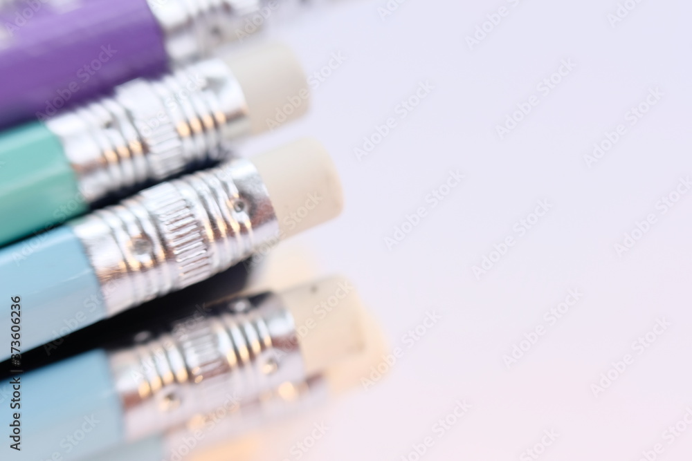 Close up pencil on table background and office supplies space for text