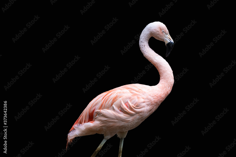 American flamingo (Phoenicopterus ruber), isolated on black background. Large species of flamingo also known as the Caribbean flamingo