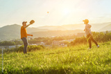 Father and son playing in baseball. Playful Man teaching Boy baseballs exercise outdoors in sunny day at public park. Family sports weekend. Father's day.