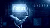 Businessman outreached hand holding a Focus business concept on a computerised screen display.