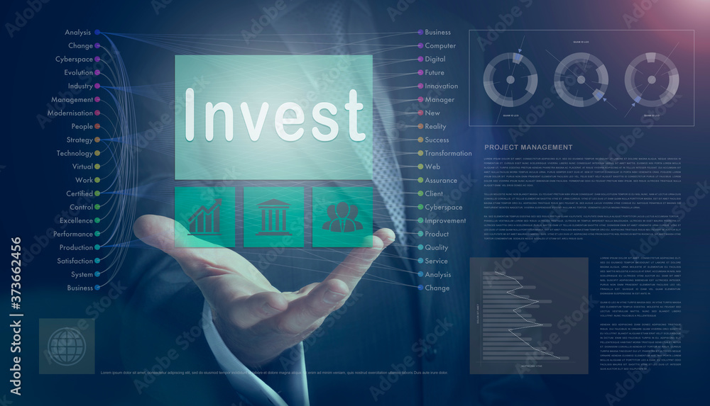Businessman outreached hand holding a Invest business concept on a computerised screen display.