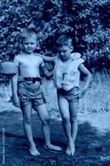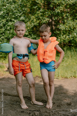 portrait of two cute little boys standing at lake shore in the forest. one boy wearing life vest, another wearing armbands.