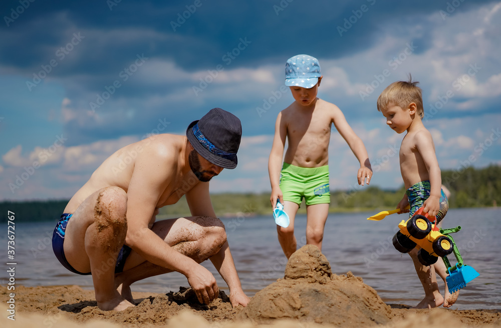 Two boys playing with father on the beach, making sand castle together. Elder boy holding a shovel, little boy holding toy tractor. Image with selective focus