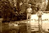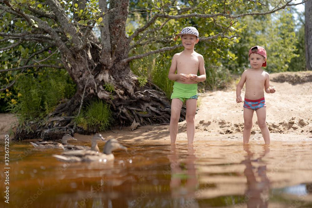 two cut little caucasian boys feeding ducks with bread on the lake, standing in the water, undressed wearing caps and trunks