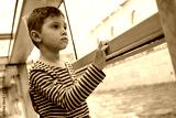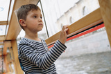 cute caucasian boy in striped henley shirt sitting on window sill of boat on a river boat tour in Saint petersburg, Russia, looking out