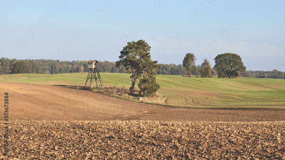 Peaceful rural landscape with hunting blind, retro color toned picture.