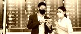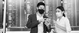 Smart asian businessman and businesswoman wear mask protection in airport terminal,discuss and planning business strategy while waiting flight on information board background.Partner meeting concept.