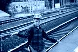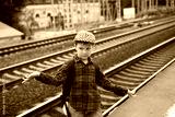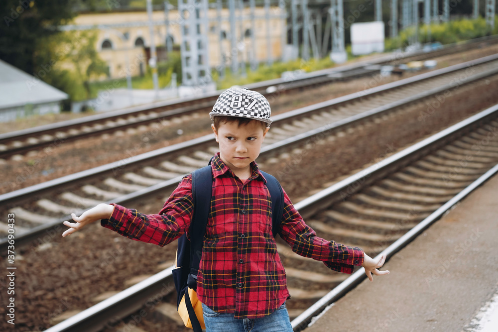 6 year old boy with backpack. posing on the train platform on summer day. rails on background