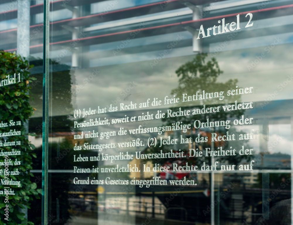 Artikel des Grundgesetz Deutschland an dem Kunstwerk Grundgesetz 49 in Berlin