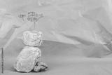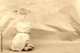 Layout made of from a pile of balancing stones and dry flower on craft beige background. Front view Copy space Monochrom