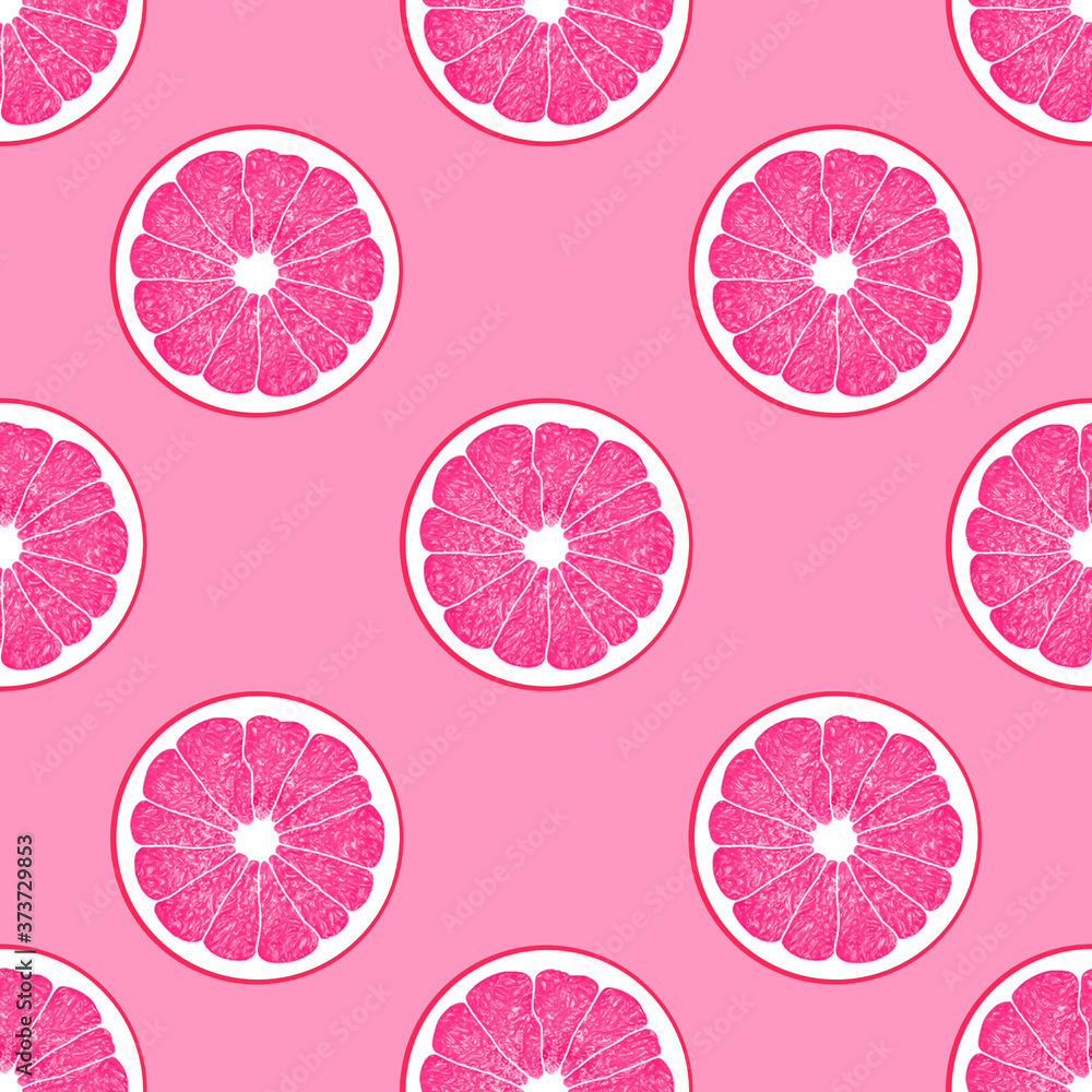 Pop art illustration with seamless pattern with grapefruit Halves of pink grapefruits on bright pink background