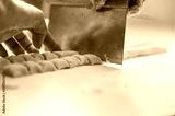 Cutting fresh homemade pasta dough to make vegan gnocchi