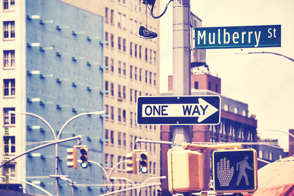New York City street signs and traffic lights by Mulberry Street, once the heart of Manhattan Little Italy, Color toned picture, USA.