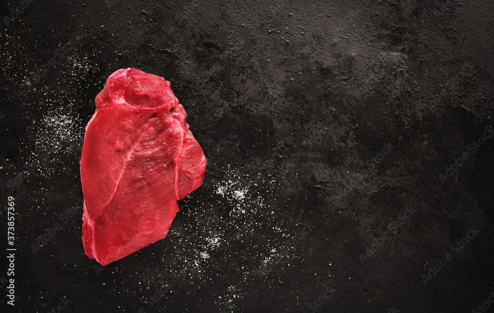 Raw beef steak with spices on a dark slate, stone or concrete background. Top view with copy space.