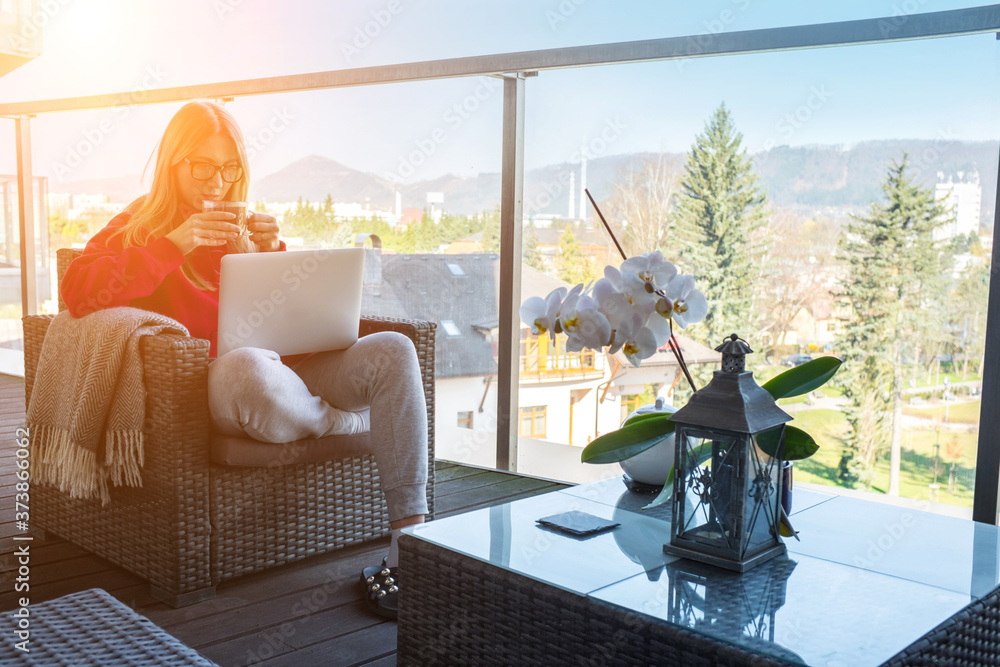 Stay at home, working in house. Woman spend free time on terrace in home clothes. Work with laptop and drinking tea. Beautiful mountain views in sunny day. Holidays time.