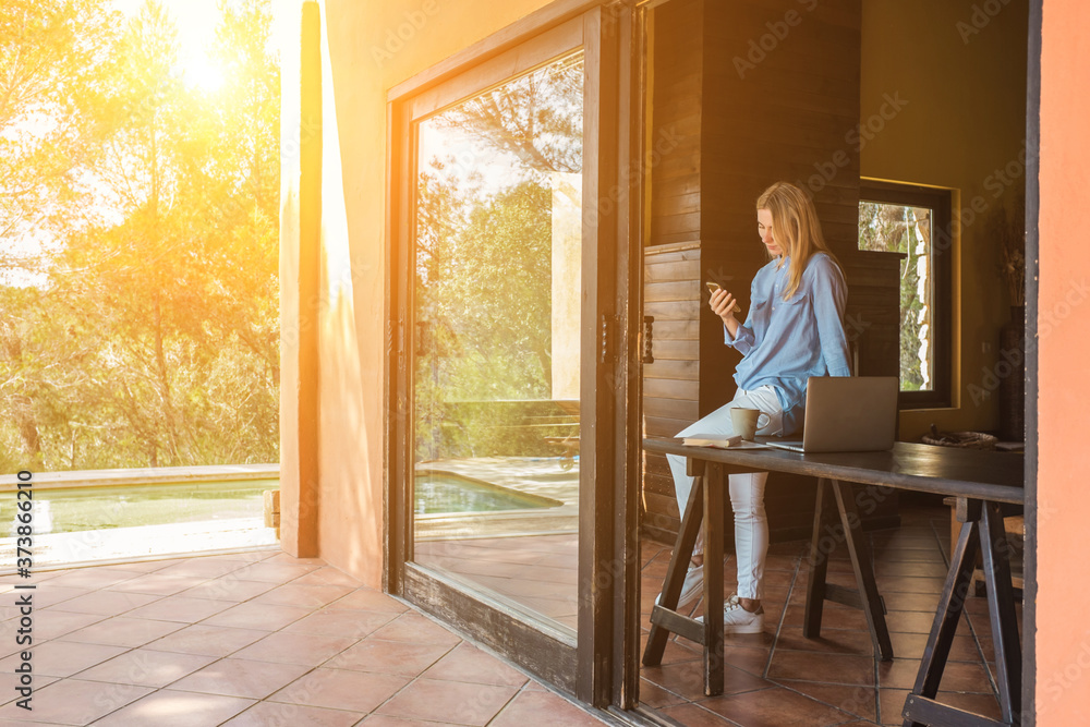 Working from home. Woman talking on video call with Family, using smartphone and drinking tea. Online chat. Spend free time on terrace. Staying connected, Social distancing, internet, chatting.