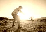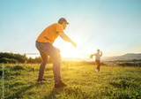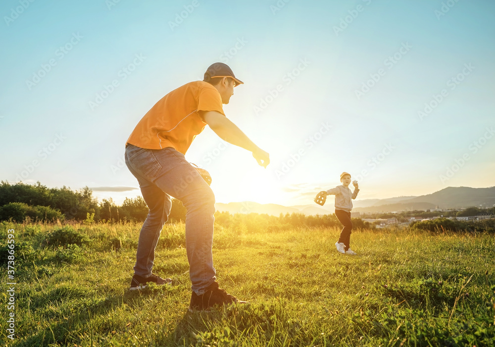 Father and son playing in baseball. Playful Man teaching Boy baseballs exercise outdoors in sunny day at public park. Family sports weekend. Father's day.