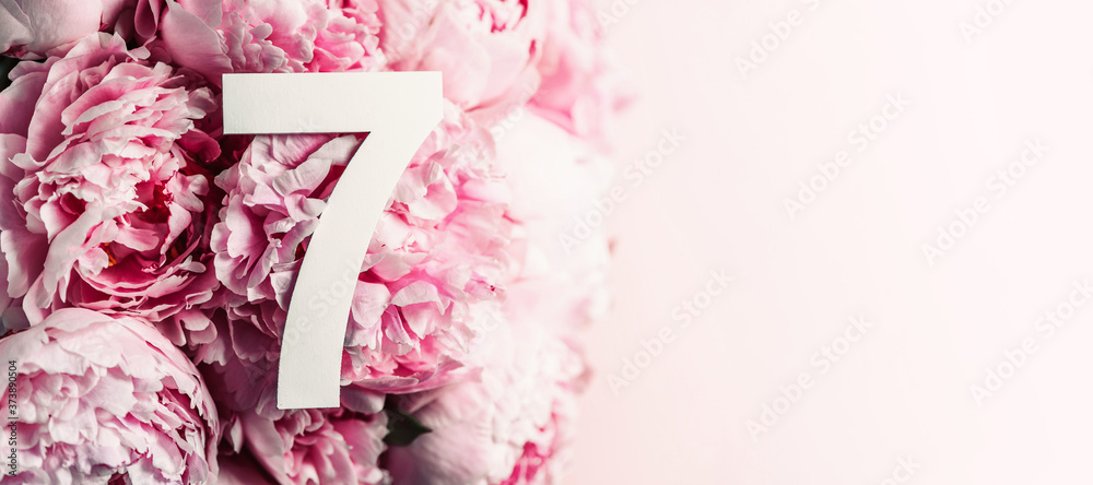 Creative layout. Pink peony flowers and digit seven 7. Birthday greeting card. Anniversary concept. Top view. Copy space. Stylish white numeral over flowers background. Numerical digit.