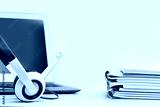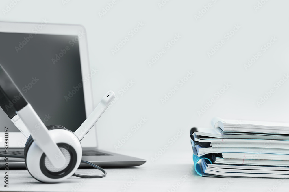 Close up. Laptop with blank screen with headphones on white desk and pile of notepads. copy space. Distant learning or working from home, online courses, shopping minimal concept. Helpdesk call center