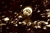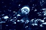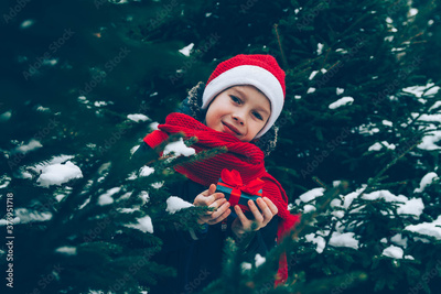 A teenage European boy in a red Santa Claus costume holds a Christmas gift in his hands. A child stands by a green fir tree.