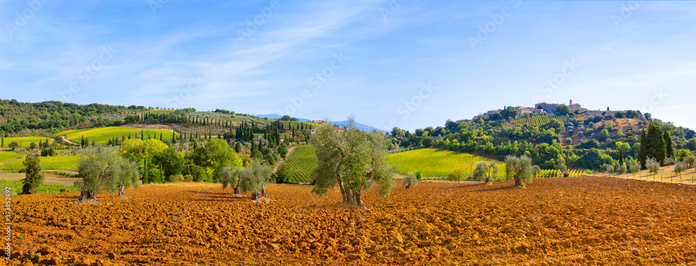 Sights in Tuscany: beautiful olive trees near Abbazia di Sant Antimo. Italy.