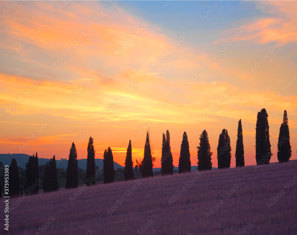 Beautiful landscape panorama in Tuscany with an avenue of cypress trees in the sunset.