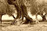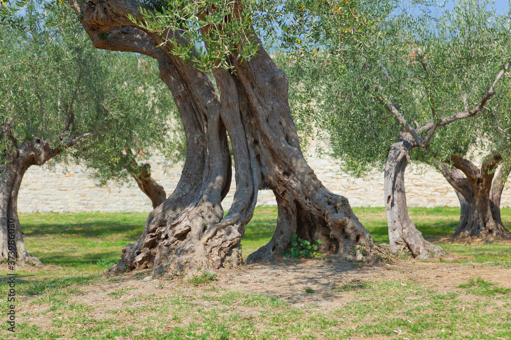 Old olive trees in the park of the castle, Castiglione del Lago in Umbria, Italy.