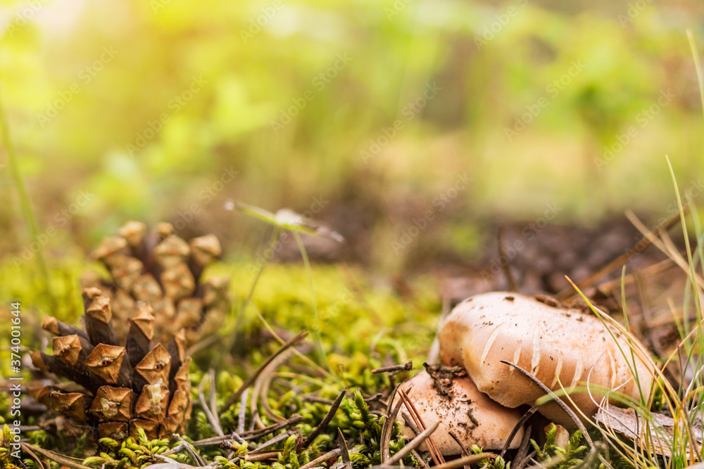 A group of boletus, suillus luteus, among the moss and pinecones in the forest, mushroom picking season, selective focus