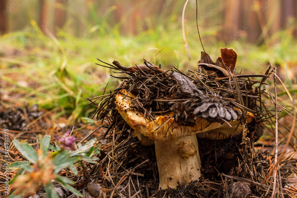 Overripe saffron milk cap grows in fallen needles and pinecones in the forest, mushroom picking season, selective focus