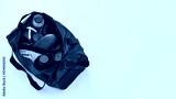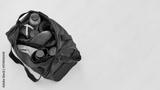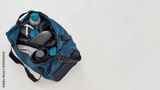 Boxing gear and accessories. Top view of sports bag with boxing gloves, hand wraps, clothing, bottle of water and other boxing equipment isolated on grey background