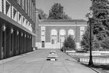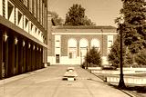 Public university campus on sunny day showing new and old architecture and open spaces with no college students present.