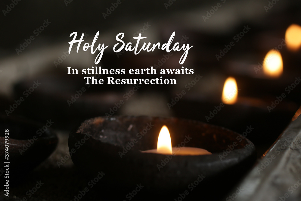 Holly week concept with candle and inspirational quote - Holy Saturday. In stillness earth awaits The Resurrection. On dark background of burning candles in traditional bowl ceramic in the church.