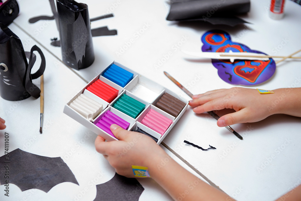 plasticine in the hands of a child, crafts made of black paper, preparation for the holiday, Halloween