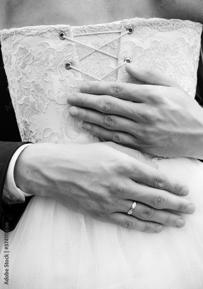 wedding, black and white, hands of the groom on the waist of the bride in a white dress, back