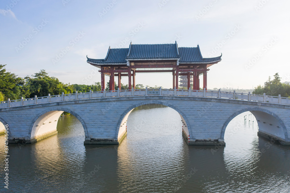 Traditional arch bridge of Huayang Lake Wetland Park in Dongguan, China