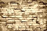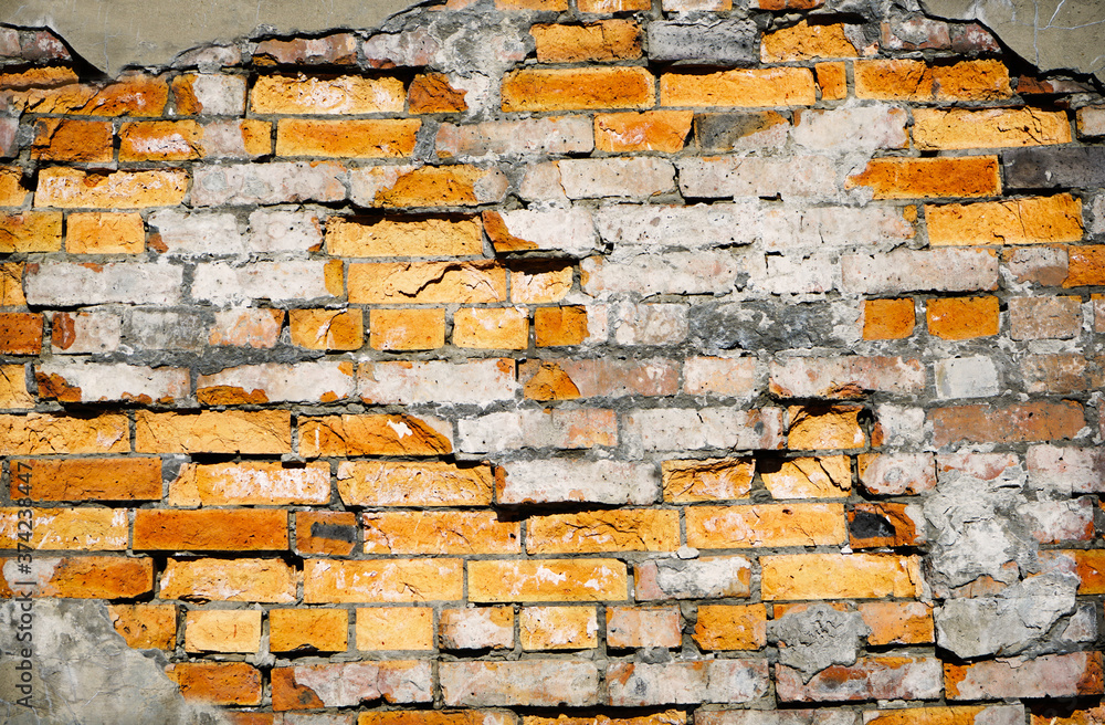 Old brick wall. Texture of a red brick wall with crumbling plaster. Brick grunge background.