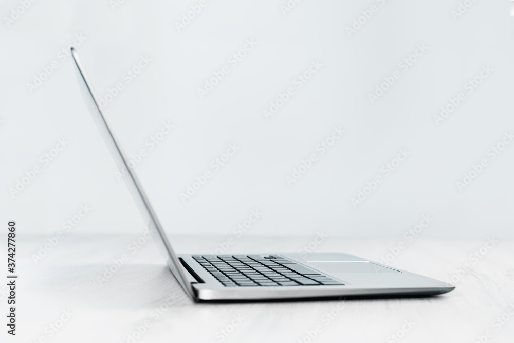 Side view of slim silver laptop on a grey desk. Copy space. Minimal. Mockup