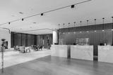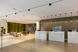 Interior of a hotel lobby with reception desks with transparent covid plexiglass lexan clear sneeze guards