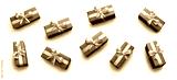 Top view of Christmas presents wrapped in red paper with gold ribbon and bow decoration isolated against a white background.