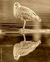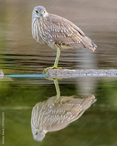 Black-crowned night heron, juvenile, fishing in lake. San Mateo County, California, USA.