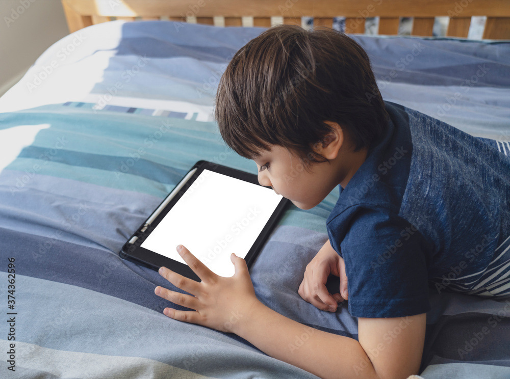 Kid using tablet for his homework, Child lying in bed playing game on digital touch pad in bed room,Young boy lying down with mock up tablet.Home schooling, Social Distance,E-learning online education