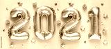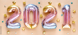 New year 2021 celebration. Foil balloons numeral 2021 and with Glitter Stars on pastel background. Flat lay