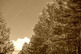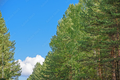 View from the bottom of the forest growing on the edges of the highway against a blue sky with white clouds