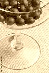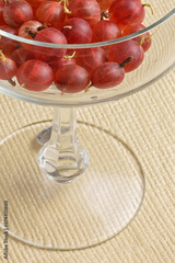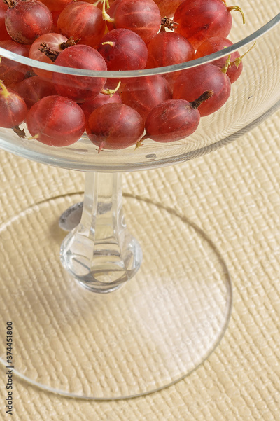 Red gooseberry berries in a glass container on a paper tablecloth background close-up.