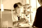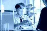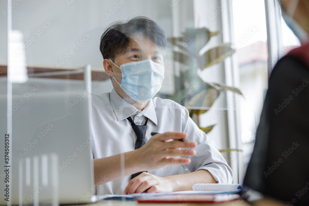business man workers wearing face mask and clear shield having discussion through glass partition at the office