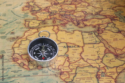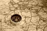 Classic round compass on background of old vintage map of world as symbol of tourism with compass, travel with compass and outdoor activities with compass