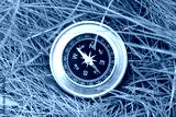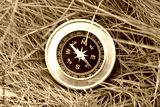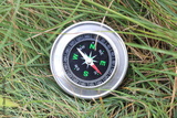 round compass on background of summer grass as symbol of tourism with compass, travel with compass and outdoor activities with compass