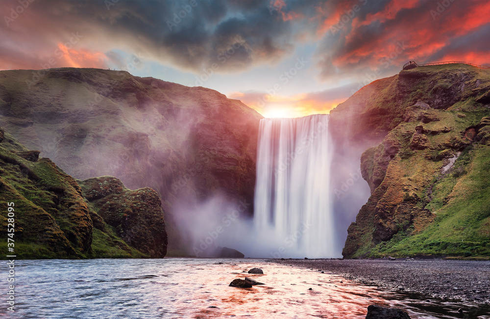 Amazing Icelandic Landscape. Incredible view of famous Skogafoss waterfall during sunset. Dramatic Scenery of Iceland. Skogafoss Waterfall. Iceland the most beautiful and best travel place. postcard