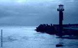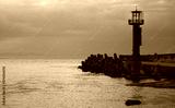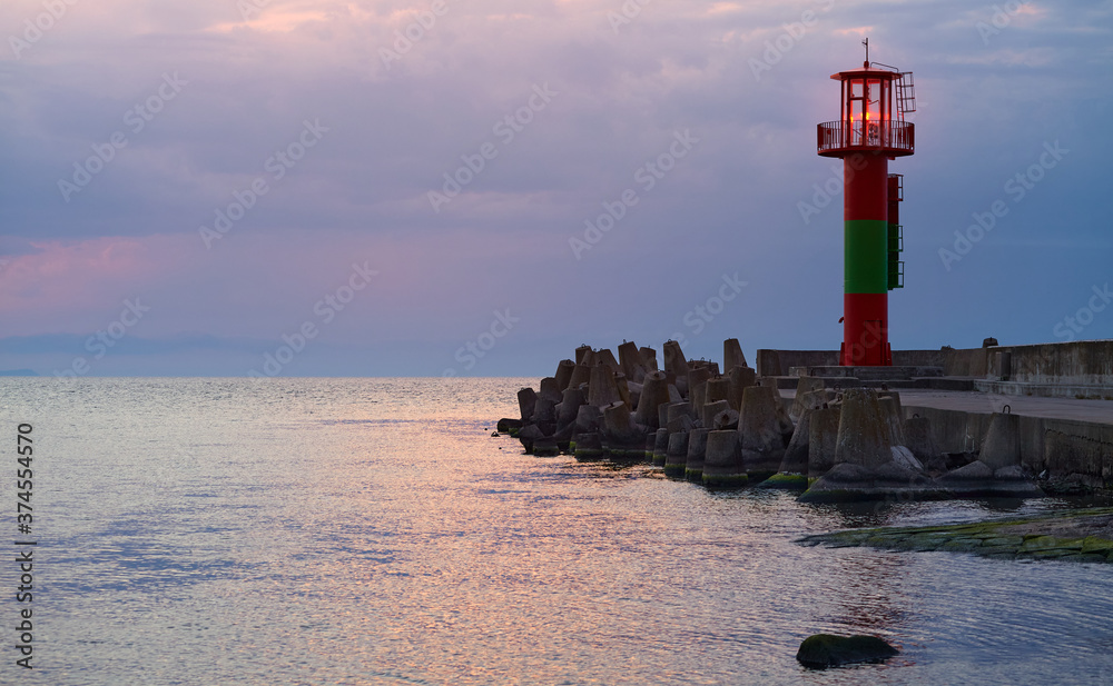 Lighthouse protected by concrete breakwater tetrapods at sunset, Swinoujscie, Poland.