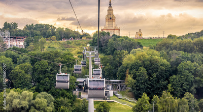 Landscape of Moscow at sunset, Russia. Scenic panoramic view of cable car and Moscow State University on Sparrow Hills.